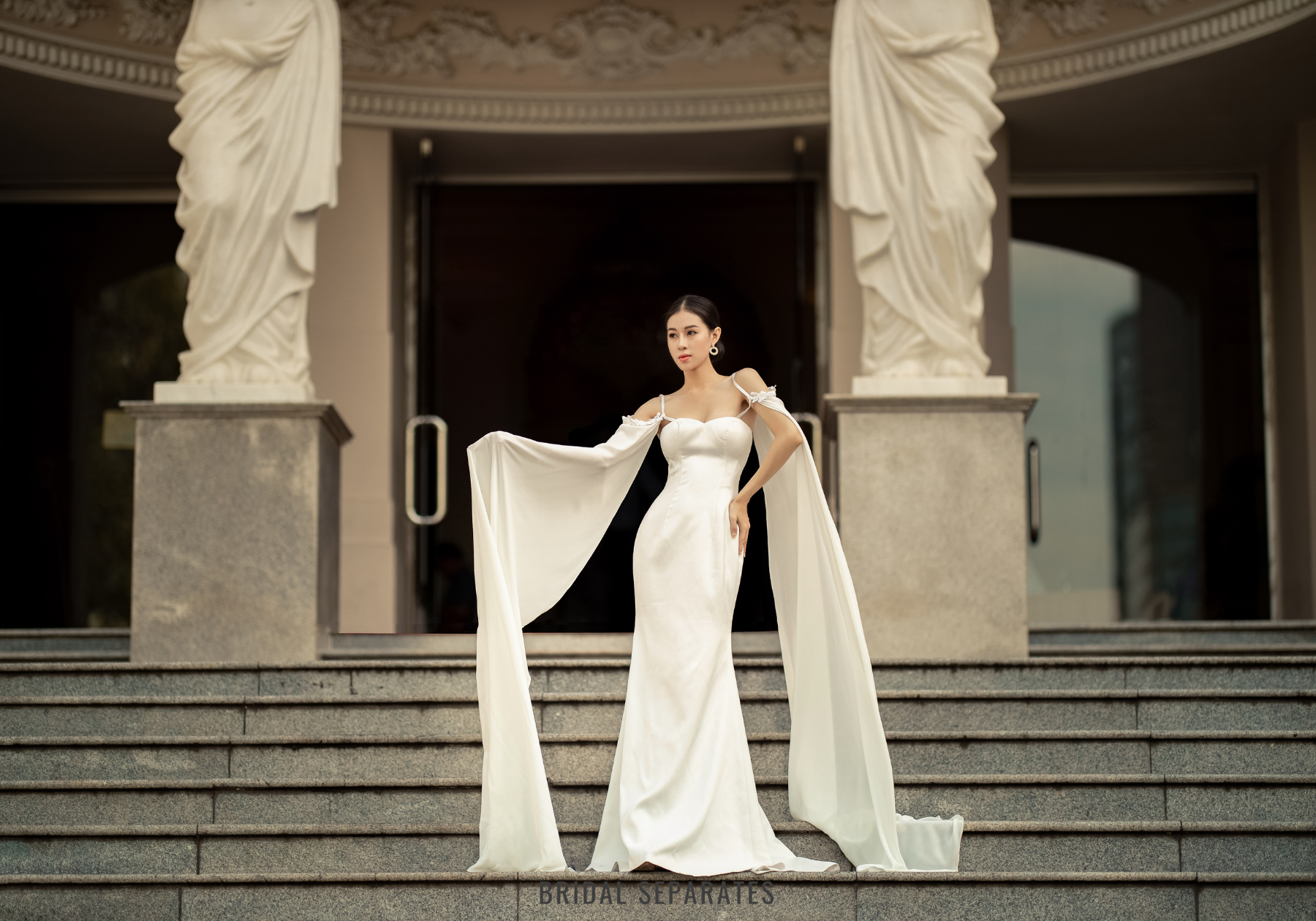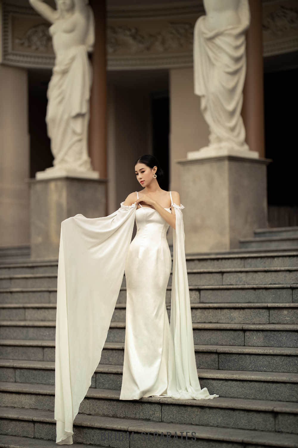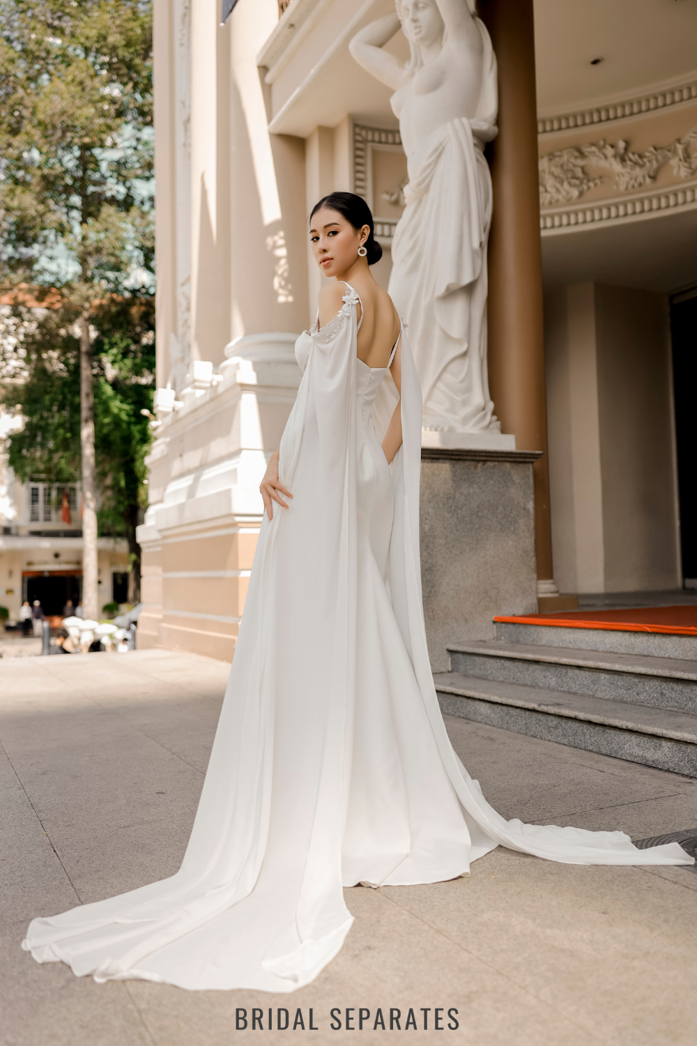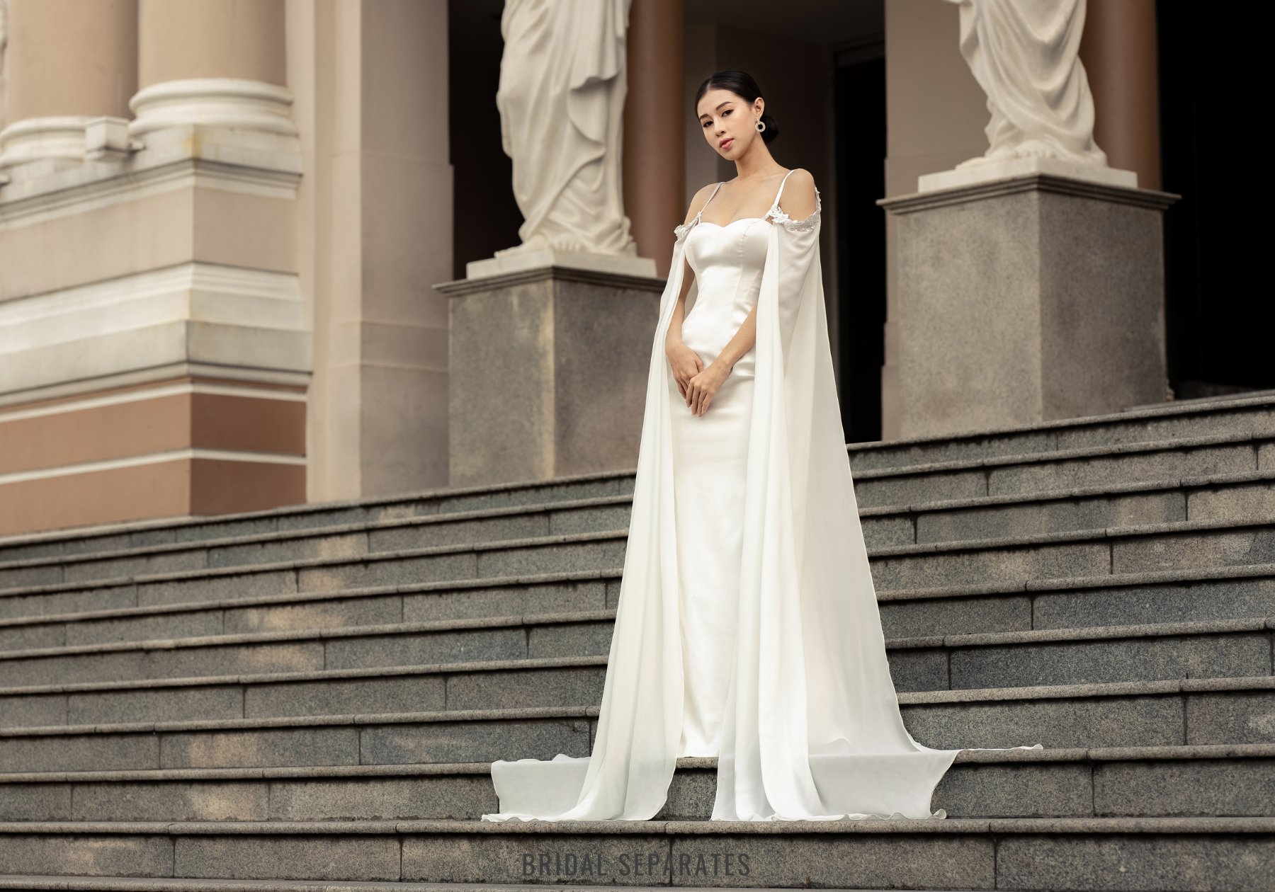Model pictured with chapel length cape